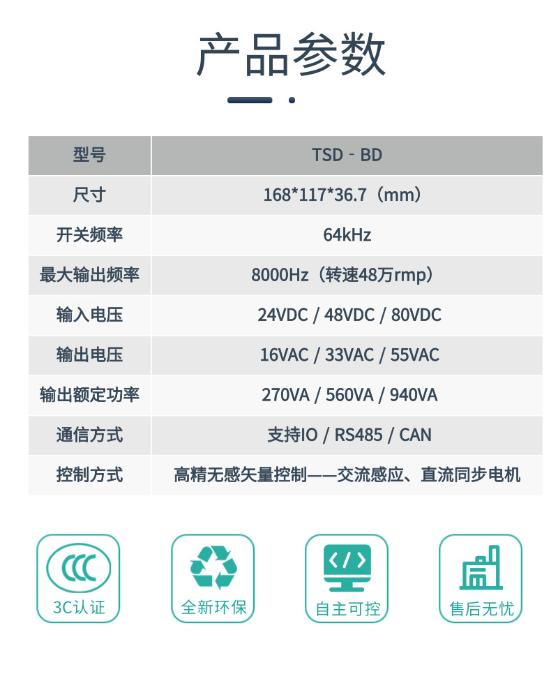 TSD-BD系列产品是一款高性能高速电机矢量驱动器,输出基波频率高达8,000Hz,可驱动480,000 rom的高速电机/电主轴。电机无需编码器,即可实现高性能的无速度传感器矢量控制,具有转速精度高、动态响应快、带载不掉速等特点,显著提高加工性能。同时,较小电流谐波,也能够显著降低电机/电主轴温升,保证电机/电主轴运行安全。